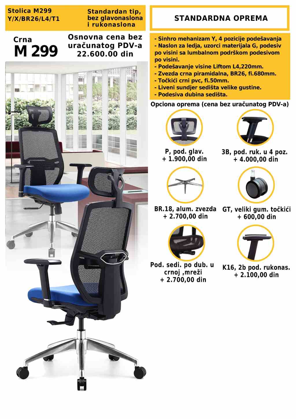 Moderna ergonomska radna stolica M 296 uklapa se uz kancelarije i radne enterijere različitih tipova, a najbolje će se slagati uz moderne poslovne prostore. Model M296 se izuzetno lako prilagođava – u ponudi je mnoštvo boja i veliki izbor dodatne opreme.