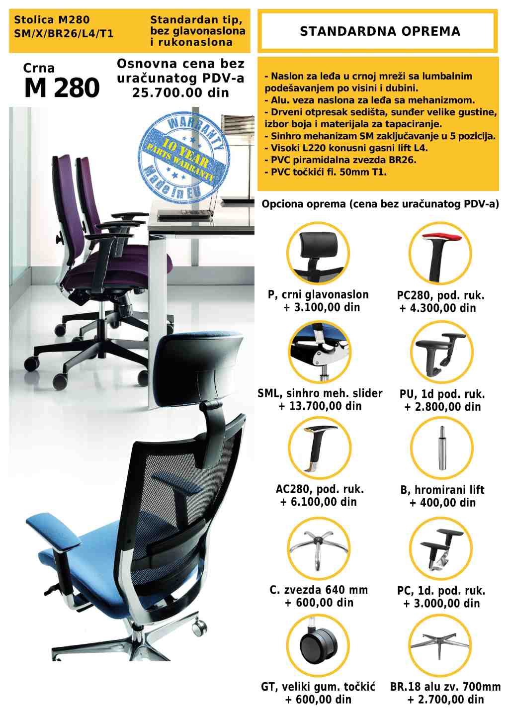 Ergonomske stolice (prodaja) M 280 je model koji će vam pružiti vrhunsku udobnost i povećati produktivnost u toku rada, zahvaljujući svojim brojnim podesivim elementima, za maksimalnu udobnost pri radu. Ono što ovu stolicu čini najboljom kupovinom u cenovnoj klasi na domaćem i evropskom tržištu su čvrstoća, nesalomivost i velika izdržljivost.