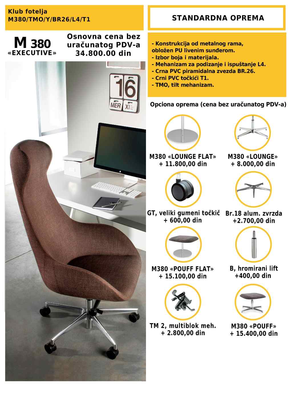 Fotelja M 380V : U ponudi su visoki i niski naslon za ledja, fotelja može biti na zvezdi, tanjiru, drvenim ili metalnim nogicama… za radne ili konferencijske prostorije, mehanizam može biti sa jednom pozicijom zaključavanja ili sa više pozicija zaključavanja u zavisnosti od potrebe i budžeta korisnika. Izbor različitih vrsta zvezdi i točkića. Veliki opseg dodatnih opcija čini fotelju prilagodljivom svakom korisniku i svakom prostoru. Sa garancijom od 2-5 godina u zavisnosti od upotrebljene komponenete čini je veoma privlačnom kako za kućnu upotrebu tako i za kancelarije.