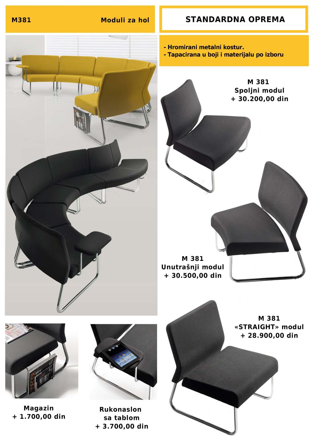 M 381 set za hol čekaonicu, Modrulj stilska klupa , idealna za čekaonice, sastavljena od pomoćne klupe, a može doći sa ili bez pomoćnog stola, i izborom materijala za tapaciranje. Prednost kod naših M modela jeste u tome što možemo ponuditi izradu u bojama po vašoj želji. Široka lepeza boja, materijala i dezena dozvoljava vam da ovaj set uklopite prema potrebi vašeg prostora.