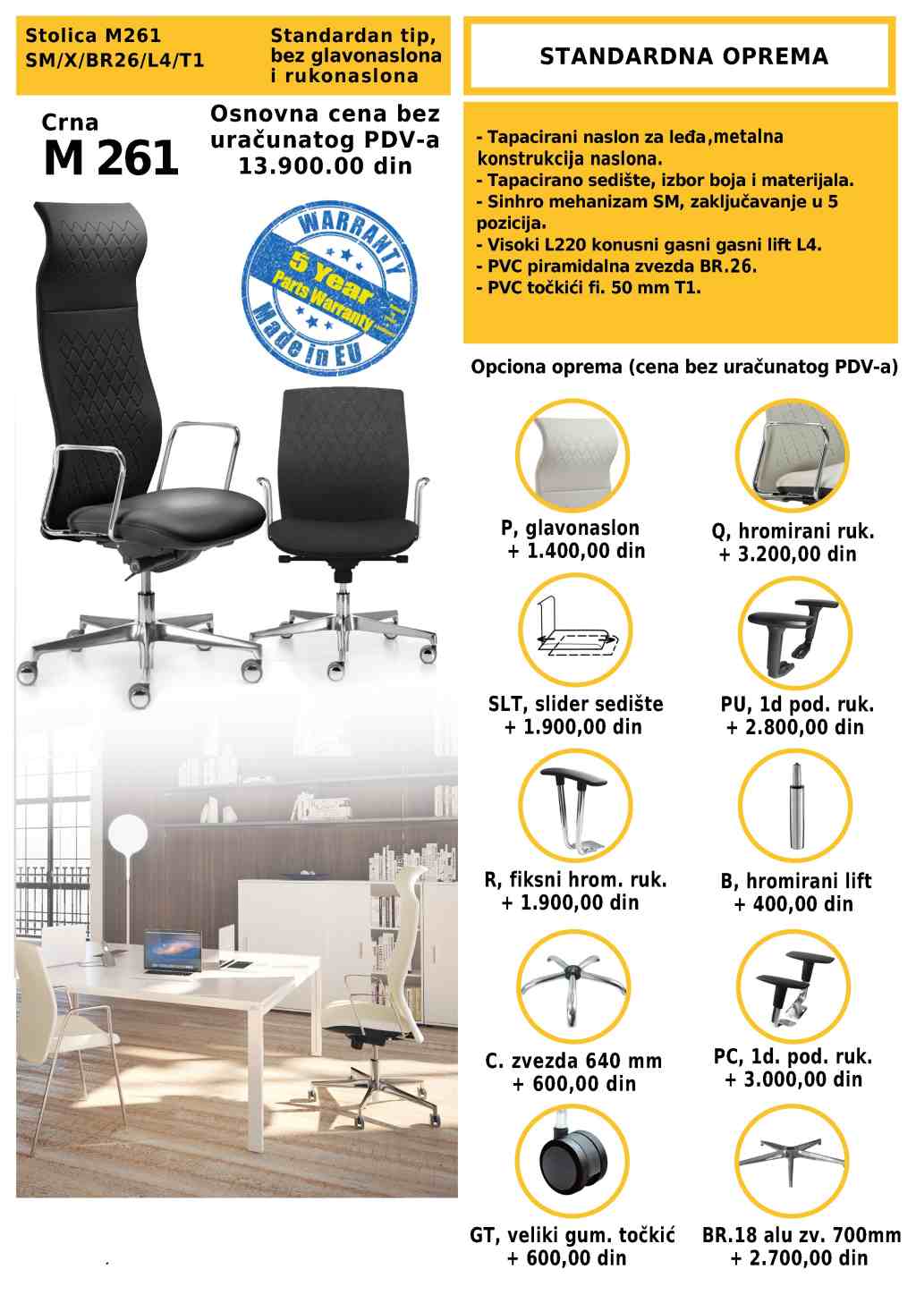 Veliki asortiman dodatnih opcija čini je fleksibilnom i prilagodljivom svakom korisniku. Mogućnost izbora pvc zvezda, točkića, stopica, liftova, rukonaslona, naslona za ledja, boja i materijala. Samim izborom opcije korisnik sam kreira stolicu i samim tim formira cenu tražene stolice. Kupovinom kancelarijskih stolica klase M izdvajate se iz svakodnevne ponude loših i kvalitetom neispitanih stolica kojima je naše tržište prezasićeno. Stičete mogućnost produžene garancije, zatim servis u i van garantnog roka, dopune kada god to želite, i još mnogo toga..