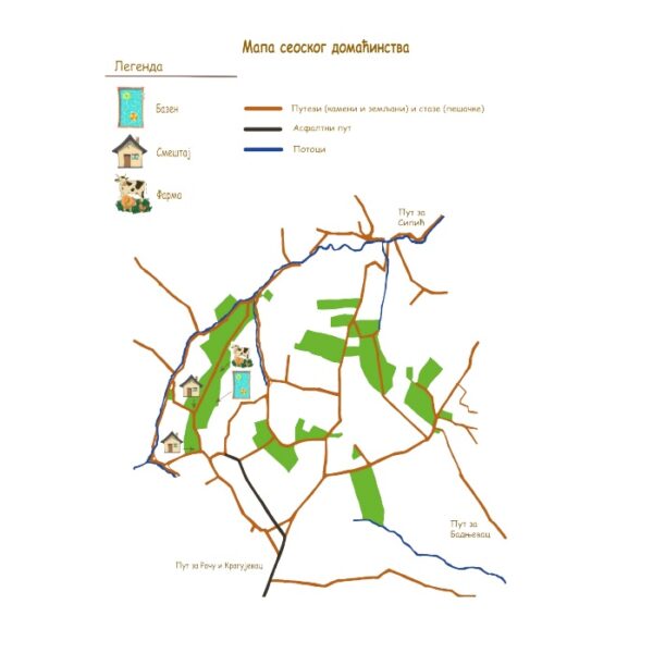Seosko domaćinstvo Šumadija je veliki kompleks koji je sastavljen od 5 starih seoskih domaćinstava. Prostire se na 30 hektara uredjene površine, koji su medjusobno povezani šumskim i seoskim stazama puteljcima i putevima.