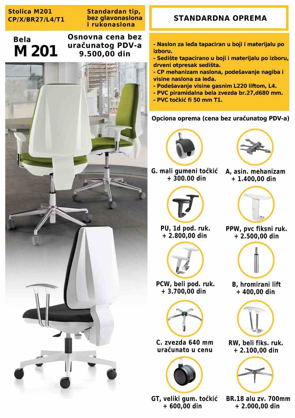 Serija M 201 kancelarijskih stolica nudi konferencijske opcije pomenutog modela, čime dobijamo na estetici i jednobraznosti poslovnog sistema. Kancelarijska stolica je većinski poreklom iz EU (Italije), kod nas se sklapa i tapacira u boji i materijalu po izboru. Veliki asortiman dodatnih opcija čini je izuzetno fleksibilnom i prilagodljivom svakom korisniku.